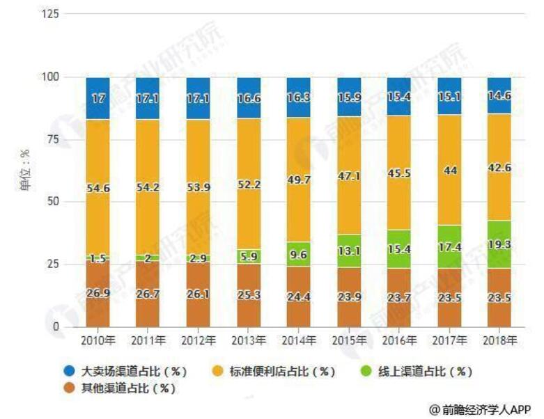 數(shù)據(jù)來源:前瞻產(chǎn)業(yè)研究院整理 從Euromonitor公布的數(shù)據(jù)來看,隨著線上流量越來越貴,線上部分的增速越來越慢,而其他部分則維持穩(wěn)定。2018年中國生活用紙行業(yè)銷售渠道中大賣場占比14.6%,標(biāo)準(zhǔn)便利店占比為42.6%,較2010年下降了12個(gè)百分點(diǎn)。而大賣場渠道占比下降了2.4個(gè)百分點(diǎn),由此看來,線上渠道的迅速增長主要是擠壓了標(biāo)準(zhǔn)便利店的渠道份額。另外根據(jù)生活紙巾的消費(fèi)習(xí)慣來看,其屬于標(biāo)準(zhǔn)化、可存放時(shí)間長的必選消費(fèi)品,在網(wǎng)上促銷是囤積一點(diǎn)也是正常合理的。 2010-2018年中國生活用紙行業(yè)銷售渠道占比統(tǒng)計(jì)情況
