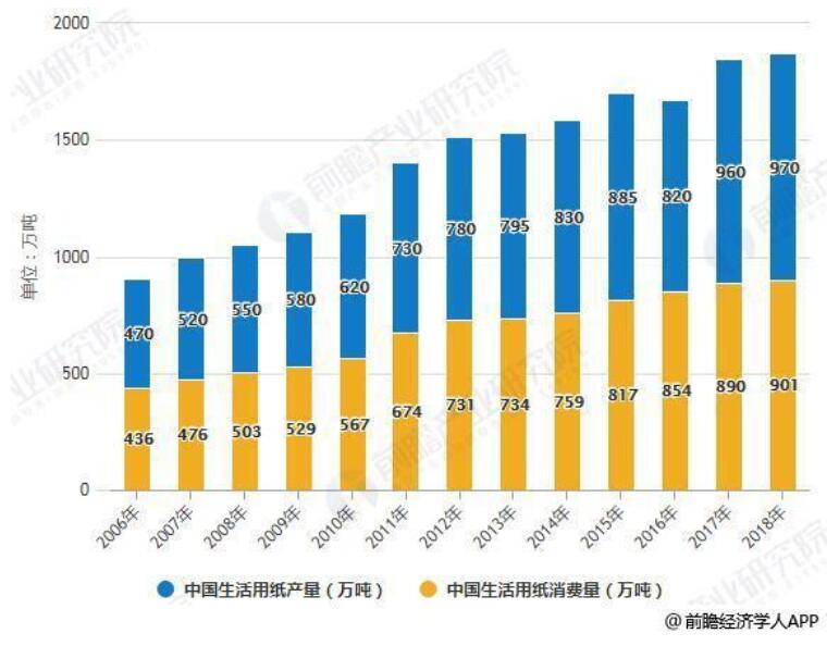 數(shù)據(jù)來源:前瞻產(chǎn)業(yè)研究院整理 中國生活用紙需求端表現(xiàn)穩(wěn)健 生活用紙作為必選消費(fèi)品,需求端表現(xiàn)穩(wěn)健。2018年造紙行業(yè)整體需求疲軟,國內(nèi)紙及紙板產(chǎn)銷分別同比下降6.2%、4.2%;但生活用紙仍然保持穩(wěn)健增長,2018年產(chǎn)量為970萬噸,同比增長1%;消費(fèi)量901萬噸,同比增長1.2%。 2006-2018年中國生活用紙產(chǎn)銷量統(tǒng)計(jì)情況