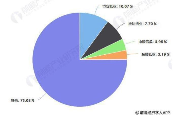 數(shù)據(jù)來源:前瞻產(chǎn)業(yè)研究院整理 中國生活用紙市場競爭激烈 生活用紙的市場競爭比較激烈,市場集中度相對(duì)較低,根據(jù)卓創(chuàng)資訊的統(tǒng)計(jì),生活用紙行業(yè)產(chǎn)能較大的前52家企業(yè)的產(chǎn)能之和,也僅占生活用紙行業(yè)總產(chǎn)能的40.44%,行業(yè)內(nèi)有大量的10萬噸以下的小產(chǎn)能。從產(chǎn)能口徑來看,行業(yè)產(chǎn)能前4的公司依次是恒安紙業(yè)、維達(dá)紙業(yè)、中順潔柔和東順紙業(yè),除中順潔柔外,其他三家公司均未上市。 行業(yè)龍頭恒安紙業(yè)是恒安國際全資事業(yè)單位,從事生活用紙產(chǎn)品生產(chǎn),擁有“心相印”、“安爾樂”等馳名商標(biāo),在重慶、湖南、山東等地建有造紙生產(chǎn)加工基地,年產(chǎn)能達(dá)到140萬噸以上。根據(jù)各公司2018年產(chǎn)能數(shù)據(jù)測(cè)算,生活用紙行業(yè)的CR4僅為24.65%,CR8和CR10也分別僅有30.45%和32.13%。 中國生活用紙市場競爭格局分析情況