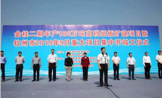 9月29日上午,欽州市金桂二期年產180萬噸高檔紙板擴建項目暨2019年9月重大項目集中開竣工儀式隆重舉行。 欽州市委書記、市人大常委會主任王革冰宣布項目開工,市委副書記、市長譚丕創和金光集團APP(中國)副總裁翟京麗分別作了致辭。儀式由欽州市副市長李從佳主持。 金光集團APP(中國)副總裁翟京麗在致辭時表示,隨著國家西部陸海新通道戰略實施和廣西自貿區的獲批,欽州也已經作為金光集團踐行國家一帶一路戰略的重要基地。金光集團將有條不紊的推進項目建設,保證工程質量,促使項目盡快實現投產達產,向欽州市人民交一份滿意的答卷,向新中國成立70周年獻禮! 欽州市委副書記、市長譚丕創在致辭時表示,欽州市將全力以赴、一心一意地抓項目,使開工項目盡快竣工投產,竣工項目盡快達產。 本次集中開竣工項目共計30項,總投資172億元,新開工21項,竣工9項,涉及工業、城鎮基礎設施、節能環保和社會民生等領域。 金桂二期工程總投資114億元,由3個子項目組成,分別是:年產180萬噸高檔紙板擴建項目、年產30萬噸雙氧水(濃度27.5%)項目、年產75萬噸化機漿擴建項目。 其中年產180萬噸高檔紙板擴建項目總投資約87.8億元,主要建設內容為2臺白卡紙機,以及給水處理站、污水處理站等配套設施,投產后年產值100億元,年上繳稅金6.5億元。