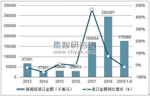 2013-2019年8月中國新聞紙進口數量及進口金額統計表