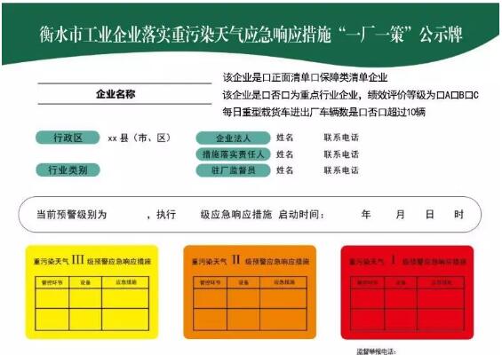 (衡水市“一廠一策”公示牌) 3、重污染應(yīng)急操作方案是否符合要求? 企業(yè)重污染天氣應(yīng)急操作方案應(yīng)符合《重污染天氣重點行業(yè)應(yīng)急減排措施技術(shù)指南》中對行業(yè)、企業(yè)級別和預(yù)警級別的要求,操作方案中規(guī)定的管控措施應(yīng)與減排清單中管控措施一致,并與實際相符。企業(yè)重污染天氣應(yīng)急操作方案名稱須與營業(yè)執(zhí)照一致。 二、如何證明企業(yè)嚴(yán)格落實了預(yù)案減排措施? 首先要嚴(yán)格落實預(yù)案中的減排措施,當(dāng)接受監(jiān)督檢查時,企業(yè)應(yīng)主動提供重污染天氣應(yīng)急操作方案、“一廠一策”公示牌、生產(chǎn)臺賬、物料出入庫記錄、企業(yè)每日用電記錄、車輛進出廠記錄(臺賬、視頻)等作證材料。 三、監(jiān)督檢查還會檢查哪些內(nèi)容? 除了以上相關(guān)材料外,監(jiān)督檢查主要還會檢查以下幾個方面:1.廢氣治理設(shè)施是否正常運行;2.無組織排放廢氣是否安裝有效收集設(shè)施;3.物料堆場是否落實揚塵治理措施;4.是否按要求落實運輸車輛管控措施。 嚴(yán)格落實重污染天氣應(yīng)急減排措施,積極提升污染治理水平是打贏藍(lán)天保衛(wèi)戰(zhàn)的關(guān)鍵,也是保護人民群眾身體健康的必然要求,頭頂?shù)乃{(lán)天白云需要你我共同守護!