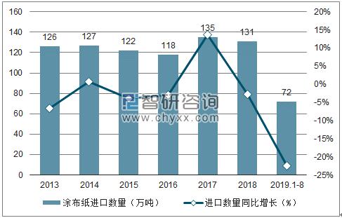 2013-2019年8月中國涂布紙進口數量趨勢圖