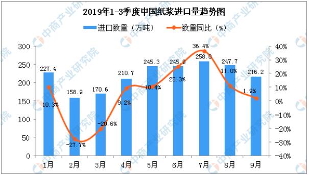 2019年1-3季度中國紙漿進口量逐漸增長,增長29.63%。2019年9月中國紙漿進口量為216.2萬噸,同比增長1.9%。