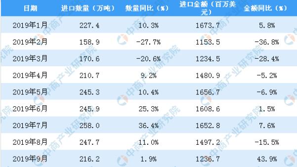 2019年1-9月中國紙漿進口數(shù)量及金額增長率情況