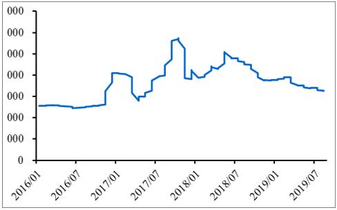 數據來源:公共資料整理 行業景氣度下行,預計短期包裝紙價格仍將承壓,長期紙價趨于穩定。2018年受到國廢價格高位運行和下游需求減弱的影響,瓦楞紙和箱板紙價格高位回落,行業景氣度下行。2019年上半年造紙行業依舊處于下行周期,同時受中美貿易戰影響,需求持續偏弱,紙價上行承壓。從19年初至今,箱板瓦楞紙庫存不斷提高,今年7月庫存天數達到20.42天,接近17年歷史庫存高位22.22天。庫存高企疊加下游需求疲弱,預計19年包裝紙價格仍將承壓。從長期來看,受制于供給端增量有限,且未來包裝紙需求增長空間大,預計長期紙價將趨于穩定。 箱板紙國內市場價格(元/噸)