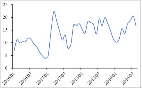 數據來源:公共資料整理 3.外廢政策收緊支撐國廢價格,原材料決定企業長期發展 外廢政策持續收緊,支撐國廢價格。由于國家對環保的重視程度不斷加大,對進口廢紙的管控愈加嚴格,進口廢紙配額逐年降低。2018年進口廢紙配額為1816萬噸,同比下降35%,外廢配額大幅減少迫使造紙企業用國廢代替外廢,國廢需求增加推動了國廢價格的上漲。國廢價格自2017年8月開始快速上漲,從1722元/噸上漲至2018年5月的2928噸/元,漲幅高達70.03%。2018年國廢均價為2591噸/元,同比提升34.10%。國廢價格從2018年二季度開始回落,2019年8月底國廢價格為2048元/噸,與18年的價格高位相比下降了30.05%,但相比17年的價格水平仍有提高。內外廢價差在2017年最高達到1563元/噸,今年下半年內外廢差價基本維持在950元/噸左右。未來隨著外廢政策持續收緊,預計國廢價格中樞上移 2009-2018年外廢進口量及增速