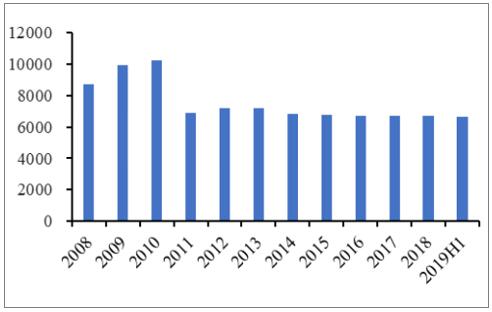 數據來源:公共資料整理 環保政策趨嚴,去產能持續推進,供給端增速放緩。國家通過提高企業排放標準和環保要求,來淘汰造紙行業內的落后產能,實現國家供給側改革去產能的目標!笆濉逼陂g,全國共淘汰落后產能3433萬噸,“十三五”期間,國家計劃進一步淘汰800萬噸落后產能。在去產能的背景下,造紙行業供給逐漸放緩,2012-2018年全國紙及紙板產量從11257.70萬噸增長至11712.50萬噸,CAGR為0.48%,2018年產量同比下降7.03%,行業去產能效果明顯。 2008-2018年紙及紙板產量及增速