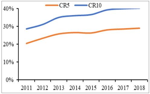 數據來源:公共資料整理 行業集中度穩步提升,提升空間廣闊。從2010年起,規模以上紙制品企業數量不斷減少,行業集中度持續提升,CR5/CR10從2010年的20.49%/28.70%提升至2018年的29.03%/40.25%。美國造紙行業在經歷環保立法去產能及行業并購之后,CR10已經達到了90%左右,與美國相比,我國包裝紙行業集中度仍有較大提升空間。 我國規模以上紙制品企業數(家)