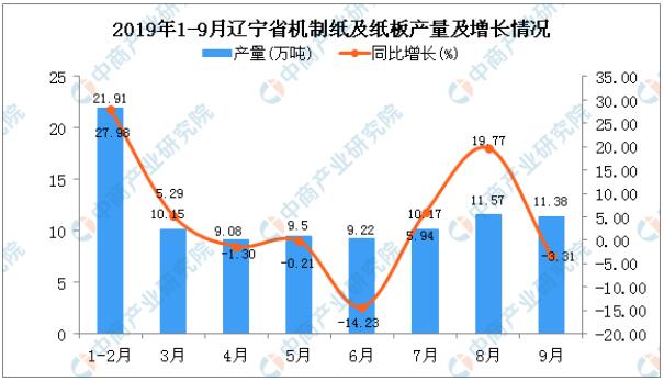 2019年1-9月遼寧省機制紙及紙板產(chǎn)量及增長情況