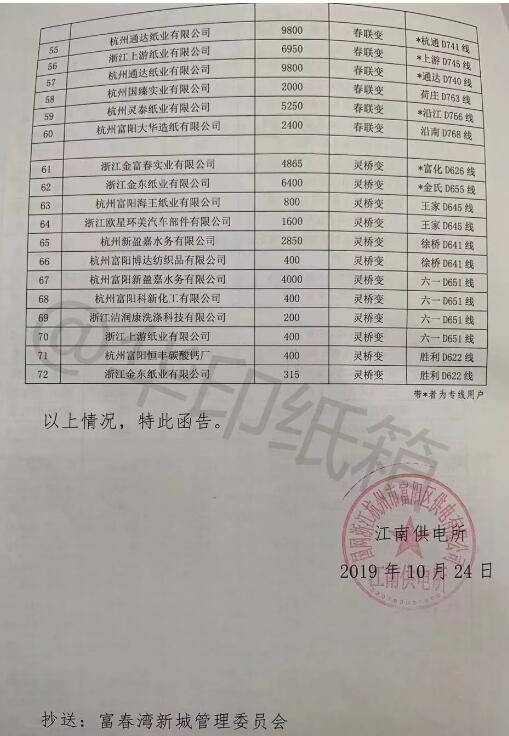 導語:因供電設備進行大檢修,浙江富陽35家造紙廠再次被迫停限產,時間將近1周。此外,據卓創造紙調研,今年浙江省繼續推進造紙改造升級,年初已關停白板紙產能達100多萬噸,2020年春節前將繼續關停100多萬噸,預計2019年中國白板紙產量將近900萬噸。2020年浙江省將繼續關停150萬噸白板紙產能,預計2020年白板紙產量800萬噸左右。這意味著,2020年浙江還有250萬噸白板紙產能將被清退!一場行業洗牌已經來臨! 供電設備檢修,富陽35家造紙廠被迫停限產近一周 近日,浙江省富陽區春江街道、大源鎮、靈橋鎮的造紙企業又被無奈停限產了!根據官方文件通知,原因是:因轄區內220KV亭山變線路設備檢修,10月31日-11月5日期間下轄相關變電所供電能力嚴重受限,為確保不發生因電力供應緊張引發其他公共安全問題,檢修期間將對轄區內相關企業實施有序用電,讓電于民。 一、停限電時間:2019年10月31日9:00-11月5日23:50 二、停限電要求: 1、在規定的停限電時間內,各工業企業停止生產用電,保障正常照明及辦公用電。 2、因有序用電方案執行不到位影響電網設備安全穩定運行的,將對相關企業及線路緊急采取停電措施。