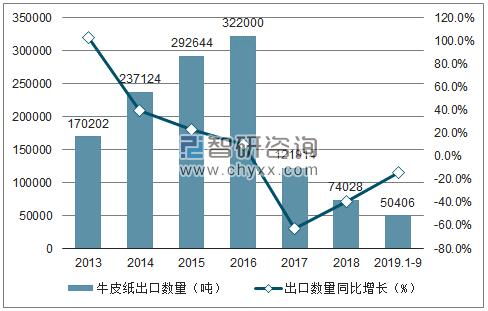 根據中國海關數據顯示:2019年1-9月中國牛皮紙出口數量為50406噸,同比下降14.1%;2019年1-9月中國牛皮紙出口金額為82712千美元,同比增長9.4%。