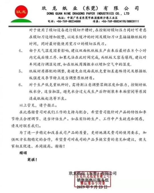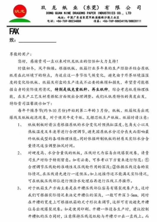 尊敬的用戶: 您好,感謝貴司一直以來對玖龍紙業的信任和大力支持! 時值初冬,風干物燥。根據紙板、紙箱行業多年來的生產經驗并結合原紙紙質在此環境下的特點,為適應這一季節性氣候變化,避免由于外界環境溫濕度的變化給紙板、紙箱及彩盒的生產造成不必要的麻煩和損失,希望貴司能根據自身的實際使用情況,特別是低克重紙種、再生紙種,綜合考慮紙質物理性能,在生產工藝及材質搭配方面做出合理調整。我們從紙質特性的角度出發,特給貴司溫馨提示如下: 每年干燥季節(約9-10月份)開始到第二年的3月份,紙板、紙箱極易出現爆線及紙板起泡現象,對于使用牛皮卡紙、瓦楞芯紙生產紙板、紙箱時請注意: 1、紙板制板時請注意根據原紙的水分變化對預熱缸溫度、包角大小以及熱板溫度及車速等進行合理調節,避免因原紙水分過分喪失而影響最終紙板成型的各項物理性能。同時依據所制紙板的材質及實際水分含量情況適當調整抽風時間。 2、對硬度高、水分含量低的紙板,壓線時尤為容易出現爆裂現象,請貴司生產時給予特別留意。如有必要,可參考以下方案來進行防范: ①合理調節壓線輪的準確性及壓線輪作用的深淺; ②依據壓線設備的實際情況,在壓線請先進行一道預壓。 如上述操作還不能滿足實際情況,可在紙板壓線部位進行預涂水處理后再進行壓線工序操作。 3、對于紙箱生產方面主要是在開槽壓線部位容易有爆裂現象產生,這時我們可根據實際情況來決定開槽位的深淺,一般可開深3-5mm,同時在開槽的寬度上可根據紙箱的尺寸形狀來調節,這樣可有效避免開槽位易出現爆裂現象。如是使用印刷、開槽一體設備生產時,建議控制開槽機的壓力同時,注意保持壓線送紙輪與開槽刀口在一直線上。而對于使用了模切設備進行模切開槽時,在控制好模切壓力同時可考慮在模切刀邊增加膠墊,以延長緩沖的時間及模切刀口直接接觸紙板的時間,同時最好能使用寬刀口的模切壓線刀。 4、由于天氣濕度因素影響,建議雙面機紙板生產出來后最好在8個小時內完成后續工序。如果無法在此時間完成,而紙板又容易爆線,建議對車間進行調濕處理,如在紙板周圍撒水以增加空氣中的濕度。 5、紙板材質搭配的調整,要避免出現面底紙克重相差懸殊情況及根據紙板強度及季節特點適當調整原紙材質。 6、對于生產低克重紙種時, 需特別注意調整漿糊濃度和張力,控制好紙板水分,適當抽濕,避免水分過大或生產后即刻裝車車廂密閉等原因造成紙板起泡等不良。 以上管見,請予指正。 在此感謝貴司對我們工作的支持與配合,希望貴司能針對產品的特性和季節特點合理調節、適當評估生產。如在實際的生產、工作中產生疑慮和困惑,請及時聯系我們。 為了進一步穩定和改善我司產品的質量,更好地滿足貴司的使用要求,加強雙方長期穩定的合作,希望貴司對我司的產品多提寶貴的意見和建議,使大家相互促進、共同提高。謝謝! 二、入秋紙板爆線高發期!"防爆"實用技巧,各位老板請收下! 此外,小編還為大家整理了技術專家團隊此前分享的一些“防爆”實用技巧,希望對大家有所幫助。 1、印刷機壓線爆線 一般情況下,低克重、低等級材質的紙板,在冬季爆線的幾率是非常大的。但是,現在很多紙箱廠使用的都是高等級的紙板,如果還出現爆線,那我們就要考慮一下紙箱壓線的問題了。 印刷的壓線分為預壓和正式壓線,預壓輪主要起到粉碎瓦楞的作用,把瓦楞壓潰后,使之更有利于紙箱壓線成型。壓線輪的正確調整及設備改進可以減少爆線的發生。 壓線的不同種類: