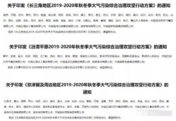 11月6日,生態(tài)環(huán)境部公布了兩份重要文件,一份是《長三角地區(qū)2019-2020年秋冬季大氣污染綜合治理攻堅(jiān)行動方案》,一份是《汾渭平原2019-2020年秋冬季大氣污染綜合治理攻堅(jiān)行動方案》。而在更早的10月11日,生態(tài)環(huán)境部還公布了一份《京津冀及周邊地區(qū)2019年-2020年秋冬季大氣污染綜合治理攻堅(jiān)行動方案》。