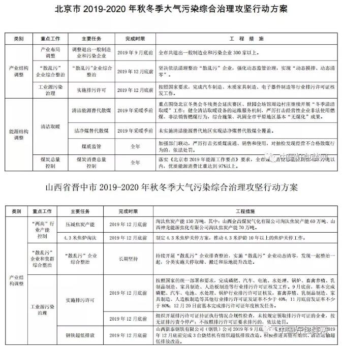 (三份文件標(biāo)題) 三份方案均稱:受厄爾尼諾影響,2019-2020年秋冬季氣象條件整體偏差,不利于大氣污染物擴(kuò)散,進(jìn)一步加大了大氣污染治理壓力,必須以更大的力度、更實(shí)的措施抵消不利氣象條件帶來的負(fù)面影響。 據(jù)中國好包裝網(wǎng)統(tǒng)計(jì),三份方案共涉及11個(gè)省級行政區(qū),包含的地級及以上城市在90個(gè)以上,要求在2019年10月1日至2020年3月31日期間,實(shí)施污染綜合治理攻堅(jiān)行動! 一、主要目標(biāo) 長三角地區(qū): 秋冬季期間(2019年10月1日-2020年3月31日),PM2.5平均濃度同比下降2%,重度及以上污染天數(shù)同比減少2%。 汾渭平原:秋冬季期間(2019年10月1日至2020年3月31日),PM2.5平均濃度同比下降3%,重度及以上污染天數(shù)同比減少3%。 京津冀及周邊地區(qū):秋冬季期間(2019年10月1日至2020年3月31日)PM2.5平均濃度同比下降4%,重度及以上污染天數(shù)同比減少6% 二、實(shí)施范圍 長三角地區(qū):上海市,江蘇省南京、無錫、徐州、常州、蘇州、南通、連云港、淮安、鹽城、揚(yáng)州、鎮(zhèn)江、泰州、宿遷市,浙江省杭州、寧波、溫州、湖州、嘉興、紹興、金華、衢州、舟山、臺州、麗水市,安徽省合肥、淮北、亳州、宿州、阜陽、蚌埠、淮南、滁州、六安、馬鞍山、蕪湖、宣城、銅陵、池州、安慶、黃山市,共41個(gè)地級及以上城市。 汾渭平原:山西省晉中、運(yùn)城、臨汾、呂梁市,河南省洛陽、三門峽市,陜西省西安、銅川、寶雞、咸陽、渭南市以及楊凌示范區(qū)(含陜西省西咸新區(qū)、韓城市)。 京津冀及周邊地區(qū):北京市,天津市,河北省石家莊、唐山、邯鄲、邢臺、保定、滄州、廊坊、衡水市以及雄安新區(qū),山西省太原、陽泉、長治、晉城市,山東省濟(jì)南、淄博、濟(jì)寧、德州、聊城、濱州、菏澤市,河南省鄭州、開封、安陽、鶴壁、新鄉(xiāng)、焦作、濮陽市(含河北省定州、辛集市,河南省濟(jì)源市)。 三、主要任務(wù) 三份《方案》所列的主要任務(wù)均有6個(gè),分別是調(diào)整優(yōu)化產(chǎn)業(yè)結(jié)構(gòu)、加快調(diào)整能源結(jié)構(gòu)、積極調(diào)整運(yùn)輸結(jié)構(gòu)、優(yōu)化調(diào)整用地結(jié)構(gòu)、有效應(yīng)對重污染天氣、有效應(yīng)對重污染天氣、加強(qiáng)基礎(chǔ)能力建設(shè)等。其中,與包裝印刷企業(yè)相關(guān)的主要集中于調(diào)整優(yōu)化產(chǎn)業(yè)結(jié)構(gòu)、加快調(diào)整能源結(jié)構(gòu)兩大任務(wù)。 中國好包裝網(wǎng)梳理過后發(fā)現(xiàn),關(guān)于調(diào)整產(chǎn)業(yè)結(jié)構(gòu)、調(diào)整能源結(jié)構(gòu)的任務(wù)又具體細(xì)分為11個(gè),包裝印刷行業(yè)被重點(diǎn)點(diǎn)名!與包裝印刷行業(yè)相關(guān)的主要任務(wù)有: 長三角地區(qū): 1、2019年12月底前,市場監(jiān)管總局出臺低VOCs含量涂料產(chǎn)品技術(shù)要求。各地要大力推廣使用低VOCs含量涂料、油墨、膠粘劑,在技術(shù)成熟的家具、集裝箱、汽車制造、船舶制造、機(jī)械設(shè)備制造、汽修、印刷等行業(yè),推進(jìn)企業(yè)全面實(shí)施源頭替代。各地應(yīng)將低VOCs含量產(chǎn)品優(yōu)先納入政府采購名錄,并在市政工程中率先推廣使用。 2、2019年12月底前,各地開展一輪VOCs執(zhí)法檢查,將有機(jī)溶劑使用量較大的,存在敞開式作業(yè)的,末端治理僅使用一次活性炭吸附、水或水溶液噴淋吸收、等離子、光催化、光氧化等技術(shù)的企業(yè)作為重點(diǎn),對不能穩(wěn)定達(dá)到《揮發(fā)性有機(jī)物無組織排放控制標(biāo)準(zhǔn)》以及相關(guān)行業(yè)排放標(biāo)準(zhǔn)要求的,督促企業(yè)限期整改。 3、2019年12月底前,上海、江蘇行政區(qū)域內(nèi)和浙江、安徽城市建成區(qū)內(nèi)基本淘汰35蒸噸/小時(shí)以下燃煤鍋爐。鍋爐淘汰方式包括拆除取締、清潔能源替代、煙道或煙囪物理切斷等;基本完成65蒸噸/小時(shí)及以上燃煤鍋爐超低排放改造,達(dá)到燃煤電廠超低排放水平。 4、指導(dǎo)工業(yè)企業(yè)制定“一廠一策”實(shí)施方案,明確不同應(yīng)急等級條件下停產(chǎn)的生產(chǎn)線、工藝環(huán)節(jié)和各類減排措施的關(guān)鍵性指標(biāo),細(xì)化各減排工序責(zé)任人及聯(lián)系方式等。鼓勵各省(市)按要求在重污染天氣應(yīng)急管理平臺上填報(bào)應(yīng)急減排清單,實(shí)現(xiàn)清單電子化管理。 汾渭平原: 1、大力推廣使用低VOCs含量涂料、油墨、膠粘劑,在技術(shù)成熟的家具、整車生產(chǎn)、機(jī)械設(shè)備制造、汽修、印刷等行業(yè),推進(jìn)企業(yè)全面實(shí)施源頭替代。各地應(yīng)將低VOCs含量產(chǎn)品優(yōu)先納入政府采購名錄,并在各類市政工程中率先推廣使用。 2、2019年12月底前,各地開展一輪VOCs執(zhí)法檢查,將有機(jī)溶劑使用量較大的,存在敞開式作業(yè)的,末端治理僅使用一次活性炭吸附、水或水溶液噴淋吸收、等離子、光催化、光氧化等技術(shù)的企業(yè)作為重點(diǎn),對不能穩(wěn)定達(dá)到《揮發(fā)性有機(jī)物無組織排放控制標(biāo)準(zhǔn)》以及相關(guān)行業(yè)排放標(biāo)準(zhǔn)要求的,督促企業(yè)限期整改。 3、2019年12月底前全部淘汰每小時(shí)10蒸噸及以下燃煤鍋爐,城市建成區(qū)基本淘汰每小時(shí)35