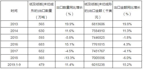 根據中國海關數據顯示:2019年1-9月中國紙及紙板(未切成形的)出口數量為479萬噸,同比增長11.4%;2019年1-9月中國紙及紙板(未切成形的)出口金額為6015238千美元,同比增長15.2%。