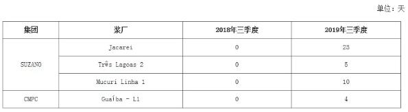 去產(chǎn)量 漿廠檢修時(shí)間增加 巴西統(tǒng)計(jì)部門(mén)公布數(shù)據(jù)顯示,2019年三季度巴西木漿產(chǎn)量501.90萬(wàn)噸,環(huán)比下降1.53%,同比下降7.82%。產(chǎn)量同環(huán)比均下降,主要是受到Suzano公司主動(dòng)降產(chǎn)量,2019年5月5日Suzano發(fā)布公告計(jì)劃減產(chǎn)紙漿年產(chǎn)量100萬(wàn)噸以上,從圖1也可以看出,發(fā)布公告后各月的產(chǎn)量均較去年同期出現(xiàn)下滑。表1所示的是漿廠的檢修時(shí)間,2018年三季度巴西主要漿廠沒(méi)有檢修情況,而今年三季度檢修時(shí)間達(dá)到42天,且主要集中在Suzano旗下的漿廠。經(jīng)過(guò)漿廠主動(dòng)降產(chǎn)量后,三季度Suzano紙漿產(chǎn)量209.5萬(wàn)噸,同比下降24%,環(huán)比下降6%;CMPC紙漿產(chǎn)量106.6萬(wàn)噸,同比下降1%,環(huán)比下降2%。 表1 巴西漿廠檢修情況
