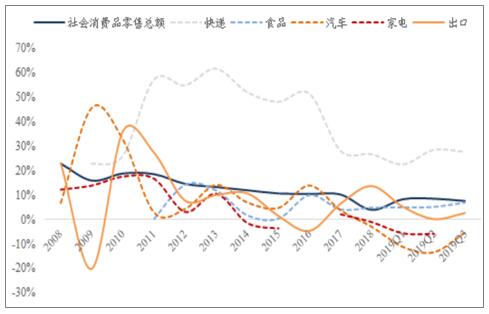 瓦楞紙板是一個(gè)多層的黏合體,最少由一層波浪形芯紙夾層及一層紙板構(gòu)成。它有很高的機(jī)械強(qiáng)度,能抵受搬運(yùn)過程中的碰撞和摔跌。瓦楞紙箱的實(shí)際表現(xiàn)取決于三項(xiàng)因素:芯紙和紙板的特性及紙箱本身的結(jié)構(gòu)。 箱板瓦楞紙下游的需求以家電、食品、汽車、快遞等社零和出口需求為主,相對具有韌性。復(fù)盤歷史需求演變,一方面社零增速自2018年有較為明顯的下滑,2019年Q1、Q2已經(jīng)出現(xiàn)企穩(wěn);一方面外需出口由于中美貿(mào)易戰(zhàn)的影響2018年同比出現(xiàn)較大幅度下滑,2019年Q2、Q3隨中美貿(mào)易關(guān)系的緩和略有上升。箱板瓦楞紙行業(yè)下游需求已經(jīng)出現(xiàn)邊際出現(xiàn)企穩(wěn)。 包裝紙下游內(nèi)外需變化