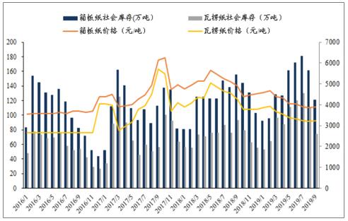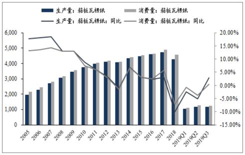 圖表來源:東吳證券研究所 箱板瓦楞2019年產(chǎn)銷量轉(zhuǎn)好。板瓦楞的生產(chǎn)量在2018年度首次出現(xiàn)負(fù)增長,其中箱板紙的表觀生產(chǎn)量2145萬噸(-10.06%)、瓦楞紙的表觀生產(chǎn)量2105萬噸(-9.85%),但自19Q1以來同比數(shù)據(jù)已經(jīng)逐季出現(xiàn)轉(zhuǎn)好,尤其2019Q3以來出貨量回升,說明下游需求出現(xiàn)企穩(wěn)。 箱板瓦楞紙生產(chǎn)量及表觀消費(fèi)