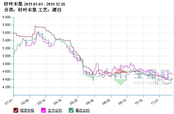 由2019年木漿價格走勢圖可以看出,相較于2018年末價格比較,第一季度木漿價格整體來看稍有上漲趨勢,但是隨著第二季度的到來木漿價格由漲轉(zhuǎn)跌,而這一波下行則一直持續(xù)到了年末,由此看出2019年木漿市場一直處于相對低迷的狀態(tài)。 1-7月份木漿價格處于震蕩下行趨勢 經(jīng)過2017年的大漲后,2018年開始木漿價格雖出現(xiàn)回落狀態(tài),但仍處于2012年以來的高位。下游需求的低迷導(dǎo)致價格回落,上游紙漿價格隨之回落。 第一季度木漿價格出現(xiàn)全年最高點(diǎn) 第一季度針葉木漿價格呈現(xiàn)先跌后漲的趨勢,而闊葉木漿價格前期堅挺隨后上行,加之春節(jié)前后傳統(tǒng)備貨期等因素相互影響,業(yè)者小幅提漲現(xiàn)貨市場報盤,但由于終端需求面遲遲未有效放量及前期外盤貨源的正常到港,導(dǎo)致主要港口地區(qū)紙漿庫存年后下降速度遲緩。而下游木漿系主要原紙市場情況來看,漲價函發(fā)布基本集中在2-3月份,提漲原因主要為節(jié)后下游補(bǔ)庫、文化紙傳統(tǒng)旺季將至、業(yè)者利潤微薄,協(xié)同性提漲紙價心態(tài)濃郁,因此帶動現(xiàn)貨木漿價格隨之上行,并在3月初出現(xiàn)全年價格最高點(diǎn)。 第二季度木漿價格持續(xù)震蕩下行直至年末 第一季度木漿價格達(dá)到最高點(diǎn)后,在平穩(wěn)了一段時間后價格開始出現(xiàn)下行。而從第二季度開始下行趨勢持續(xù)蔓延,直至年末,木漿現(xiàn)貨價格都未出現(xiàn)大幅上升的利好態(tài)勢。二、三、四季度木漿價格持續(xù)下滑的主要原因是,首先木漿市場詢盤氛圍清淡,下游需求持續(xù)萎靡,紙廠基本以剛需采購為主,導(dǎo)致木漿市場成交有限;其次受增值稅下調(diào)、中美互征紙漿關(guān)稅和港口庫存不斷高企的影響,市場供過于求現(xiàn)象明顯,且去庫緩慢且壓力明顯;最后隨著金九銀十傳統(tǒng)旺季的來臨,但下游市場需求并未完全釋放,下游客戶對原材料采購相對謹(jǐn)慎,主動備貨意愿不強(qiáng),市場供需不平衡的現(xiàn)象未能得到有效緩解,成交整體偏弱。 紙漿期貨對于木漿現(xiàn)貨價格也起到一定影響