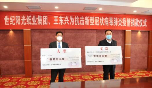 2月3日,世紀(jì)陽光紙業(yè)集團(tuán)與其董事長王東興分別向昌樂縣慈善總會(huì)捐款100萬元和30萬元,定向用于新型冠狀病毒感染的肺炎疫情防控工作,助力打贏疫情防控阻擊戰(zhàn)。 東順集團(tuán)