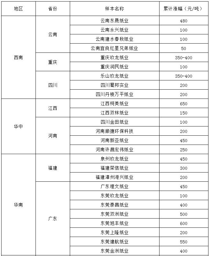 導語:2月24日前后,包裝紙迎來一輪新一輪上漲,價格累計漲幅最高突破600元/噸,可謂漲價異常兇猛。那么到底是什么原因促使價格累計上漲突破600元/噸呢?漲價還能持續多久? 據隆眾資訊監測調研,規模紙業將于明日發起新一輪上漲,累計漲幅400-450元/噸,截止發稿前累計2輪調價的企業多為中小型企業,共計50家,其中中小企業多涉及山東、河南、廣東、云南、四川、重慶紙企,瓦楞、箱板紙累計漲幅在100-600元/噸不等。部分企業價格漲幅情況如下: