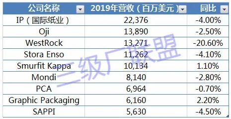 排名第一的仍然是美國的紙包裝行業(yè)領袖國際紙業(yè)(IP),年營收224億美元。王子造紙(Oji)、WestRock、Stora Enso分別位列第二、三、四位,2019年營收分別達到139億美元、133億美元、113億美元。