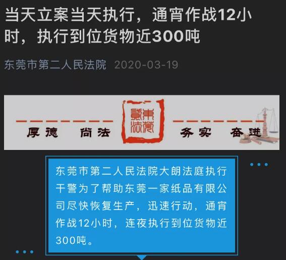 1、東莞一紙品公司面臨違約著急復產 ,向法院緊急“求救” 2020年3月6日上午,廣東省東莞市大朗法庭執行干警接到東莞某紙品有限公司的緊急申請,請求返還存放在被執行人東莞某印務有限公司的一批貨物。 紙品公司稱,該批貨物是去年國外客戶下單定做的產品,去年把單外發給了大朗鎮一家印務公司。但印務公司遲遲未能交貨,國外客戶已經在催單,紙品公司面臨違約責任。而且該批貨物受海關監管,如果未能完工順利出口,紙品公司納稅方面也會有很大損失。 今年春節前的1月中旬,該印務公司因涉其他債務被法院查封了機器設備,隨后宣布關門停業。印務公司拖欠200多名工人的工資,還拖欠了廠房房東租金。紙品公司請求法庭盡快執行,以便該公司早日領回成品、半成品,及時組織趕工交貨出口,以減少經濟損失。 大朗法庭當天立案。執行員邱基林負責的執行小組承辦此案。邱基林拿到案件材料后,立即致電房東通報情況,房東表示愿意協助執行?紤]到涉及貨物數量眾多,為了交接工作順利進行,邱基林組織紙品公司與印務公司先對眾多送貨單進行核對。 2、執行干警“助攻”,紙品公司順利拿回288.87噸產品 3月6日下午17時許,執行小組4名干警來到印務公司現場。因為欠薪問題,印務公司還有一大批工人滯留,F場約七八十個工人吵吵鬧鬧,要求先拿到工資才讓搬走貨物。 執行干警耐心給工人們做了釋法工作,要求他們按法律途徑解決欠薪問題。半小時后,場面終于基本平息下來。 為了保障貨物的順利交接,執行干警與雙方當事人商定了交接貨物的流程細節,并邀請工人代表現場見證交接過程。 當天下午18時,紙品公司找來的運輸大卡車開始搬運貨物。執行小組一邊維持現場秩序,一邊仔細核對相關送貨單和過磅數據。 由于貨物數量巨大,清點核對工作非常繁重。當晚21時,執行小組叫了外賣快餐,匆匆吃過晚飯后,繼續堅守現場。搬運貨物的大卡車一共跑了24趟。當執行干警終于將最后一車涉案貨物移交到紙品公司手上并核對完所有數據時,已經是7日早上6點。他們連夜作戰了整整12小時。經清點,移交貨物合計凈重288.87噸。