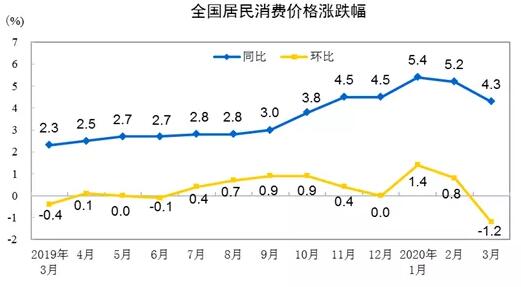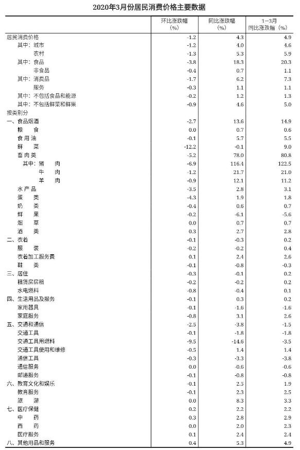 2020年3月,全國居民消費(fèi)價(jià)格同比上漲4.3%。其中,城市上漲4.0%,農(nóng)村上漲5.3%;食品價(jià)格上漲18.3%,非食品價(jià)格上漲0.7%;消費(fèi)品價(jià)格上漲6.2%,服務(wù)價(jià)格上漲1.1%。一季度,全國居民消費(fèi)價(jià)格比去年同期上漲4.9%。 3月份,全國居民消費(fèi)價(jià)格環(huán)比下降1.2%。其中,城市下降1.2%,農(nóng)村下降1.3%;食品價(jià)格下降3.8%,非食品價(jià)格下降0.4%;消費(fèi)品價(jià)格下降1.7%,服務(wù)價(jià)格下降0.3%。