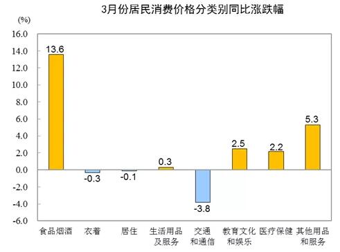各類商品及服務(wù)價(jià)格同比變動(dòng)情況 3月份,食品煙酒類價(jià)格同比上漲13.6%,影響CPI(居民消費(fèi)價(jià)格指數(shù))上漲約4.10個(gè)百分點(diǎn)。 食品中,畜肉類價(jià)格上漲78.0%,影響CPI上漲約3.44個(gè)百分點(diǎn),其中豬肉價(jià)格上漲116.4%,影響CPI上漲約2.79個(gè)百分點(diǎn);水產(chǎn)品價(jià)格上漲2.8%,影響CPI上漲約0.05個(gè)百分點(diǎn);蛋類價(jià)格上漲1.9%,影響CPI上漲約0.01個(gè)百分點(diǎn);鮮果和鮮菜價(jià)格分別下降6.1%和0.1%,合計(jì)影響CPI下降約0.12個(gè)百分點(diǎn)。 其他七大類價(jià)格同比四漲三降。其中,其他用品和服務(wù)、教育文化和娛樂價(jià)格分別上漲5.3%和2.5%,醫(yī)療保健、生活用品及服務(wù)價(jià)格分別上漲2.2%和0.3%;交通和通信、衣著、居住價(jià)格分別下降3.8%、0.3%和0.1%。