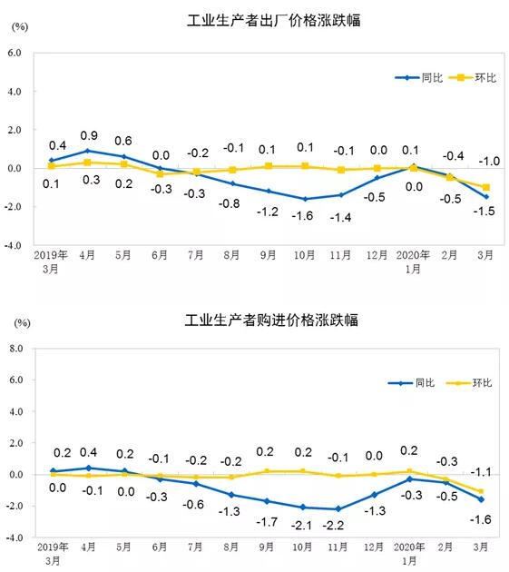 3月工業(yè)生產(chǎn)者出廠及購進(jìn)價(jià)格 2020年3月,全國工業(yè)生產(chǎn)者出廠價(jià)格同比下降1.5%,環(huán)比下降1.0%;工業(yè)生產(chǎn)者購進(jìn)價(jià)格同比下降1.6%,環(huán)比下降1.1%。一季度,工業(yè)生產(chǎn)者出廠價(jià)格比去年同期下降0.6%,工業(yè)生產(chǎn)者購進(jìn)價(jià)格下降0.8%。