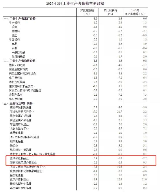 3月造紙及紙制品出廠價(jià)格同比下降1.7% 從3月工業(yè)生產(chǎn)者價(jià)格主要數(shù)據(jù)表中獲悉,3月主要行業(yè)出廠價(jià)格中,造紙及紙制品業(yè)環(huán)比上月上漲0.9%,同比去年下跌1.7%,一季度同比下跌2.7%。