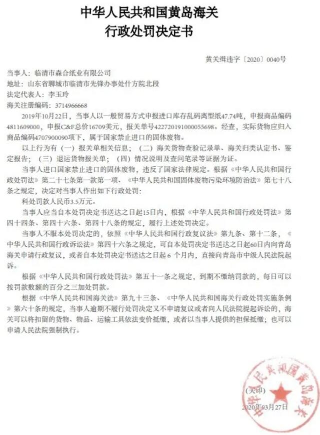 2020年4月3日,青島海關網站發布中華人民共和國黃島海關關于臨清市森合紙業有限公司擅自進口國家禁止進口固體廢物案的處罰決定(黃關緝違字〔2020〕0040號)。