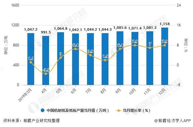 2019年全年中國機制紙及紙板產量超1.25億噸 根據國家統計局數據顯示,2018年全年中國機制紙及紙板(外購原紙加工除外)產量累計達到了11660.6萬噸,累計下降1.5%。截止至2019年12月中國機制紙及紙板(外購原紙加工除外)產量為1158萬噸,同比增長7.9%。累計方面,2019年1-12月中國機制紙及紙板(外購原紙加工除外)產量達到12515.3萬噸,累計增長3.5%。 2019年1-12月中國機制紙及紙板產量當月值統計及增長情況