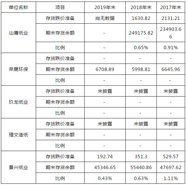 注:山鷹紙業(yè)尚未披露年報,故采用2019年1-9月存貨周轉(zhuǎn)率并年化,另玖龍紙業(yè)年度報告財務(wù)報告期為上年六月末至本年六月末,已相應(yīng)調(diào)整。 報告期內(nèi),同行業(yè)公司由于銷售區(qū)域、客戶集中度、產(chǎn)品細分類別、存貨管理水平等因素導(dǎo)致存貨周轉(zhuǎn)率存在一定差異,整體而言公司存貨周轉(zhuǎn)率高于山鷹紙業(yè)、玖龍紙業(yè)和理文造紙,低于榮晟環(huán)保。 存貨跌價計提
