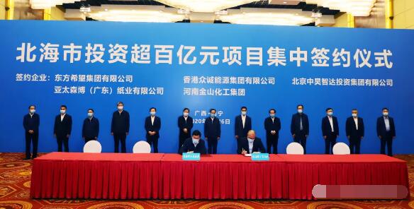 4月26日,廣西北海市投資超百億元項(xiàng)目集中簽約儀式在南寧成功舉行,亞太森博(廣東)紙業(yè)有限公司投資的林漿紙一體化項(xiàng)目等5個(gè)投資超百億元項(xiàng)目在簽約儀式上成功簽約。