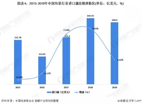 2019包裝行業進口額減少 在包裝行業進口市場上,2019年包裝行業進口額經歷的兩年增長后開始下降。2019年中國包裝行業完成累計進口額140.4億美元,同比下降1.42%。