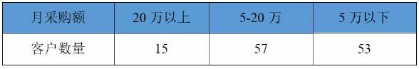吃飽的第二步——分析客戶結構。從上述客戶結構來看,雖然工廠合作客戶總數超400家,但下單頻次高的A類客戶數量并不高,只占合作客戶總數四分之一左右。而下單周期在7天以上的高達50%,由此說明多數客戶與工廠雖有合作,但合作程度并不深,分析完客戶結構,我們才有可能針對每類客戶結構制定不同拜訪政策。 吃飽第三步——分析每類客戶訂單結構。導出客戶月度訂單列表,對于A類客戶,工廠應根據客戶下單量將客戶再分為大、中、小客戶。如表2,我們發現A類客戶中月采購額五萬以下的占到53家,而53家小客戶應作為工廠的主要目標對象,他們的訂單可能更多下給競爭對手。業務員可根據客戶列表和連續兩月實際采購量,逐一對比分析,了解客戶是否有增量空間。對于確定有增量空間的客戶再進行有目的的拜訪,了解客戶不下單的原因,同時向老板申請優惠政策,針對性做出一些打法讓客戶下單。