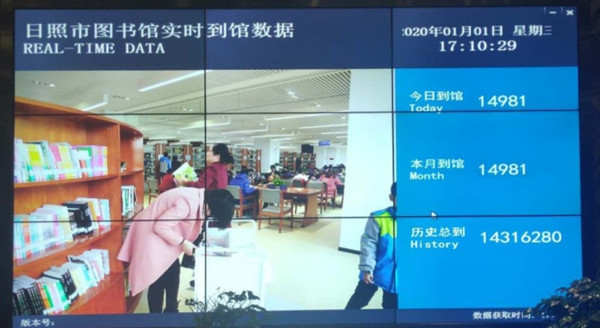 “今日到館14,981人次,累計到館14,316,280人次”。這是2020年1月1日下午5時10分29秒日照江和圖書館(日照市圖書館)一樓大屏顯示的實(shí)時數(shù)字。