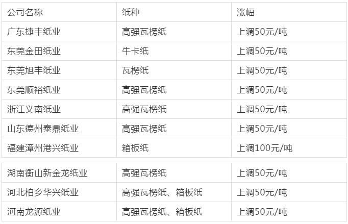 5月下旬至今,已有100多家紙廠跟漲50-200元/噸 6月初這波行情起于5月下旬。紙箱查查監測顯示:當時,玖龍三大基地聯手拉漲,理文、聯盛、山鷹等100余家紙廠跟調,漲幅50-200,浙江山鷹廢紙甚至3天連漲4次,市場普遍看漲。 東莞玖龍紙業:5月25日上調牛卡紙價格50元/噸,上調再生牛卡紙價格50元/噸。 太倉玖龍紙業:5月25日起上調再生牛卡紙價格50元/噸。 重慶玖龍紙業:5月25日起上調地龍再生、江龍再生箱板紙價格50元/噸,上調箱板紙價格50元/噸。 另一大佬理文方面于5月20日全線領漲后,5月29日廣東理文再次小幅上調包裝紙價格,這也是搶先一步為接下來6月的紙業行情奠定了上漲的基調。 在經歷了上半年長達幾個月的疫情停產、艱難復工、訂單萎縮之后,不少紙廠都蠢蠢欲動,陸續搶在5月底6月初展開了漲價“攻勢”,急切地想彌補此前的虧空。 部分紙廠漲價函 河南亨利紙業:由于近期原材料價格持續上漲,造成生產成本增加,從6月3日起我司紙價上調50元/噸。 瀏陽市銀河紙業:鑒于目前國產廢紙快速上調及其它政策等因素的影響,導致本公司的生產成本大幅上漲,從6月1日起本廠瓦紙價格上調100元/噸。 東莞市金田紙業:由于受原材料價格普遍上漲的影響,公司決定自6月1日起對金娃牌環保牛卡紙價格上調50元/噸。本次調價含之前已收的預付款及未交付的訂單。 東莞建暉紙業:受原材料及其它綜合成本上升影響,5月28日起我司生產的各種等級涂布灰底白板紙價格上調100元/噸。 江門市明星紙業:由于廢紙等原材料價格上漲,公司決定從5月29日起所有系列紗管紙上調50元/噸。 玉田縣順發實業:因受近日原材料價格持續增漲,貨源緊張的因素且環保成本增加,公司決定自5月22日起所有克重及品項的成品紙每噸上調50元。 此外,為了給廣大客戶提供更優質的牛卡紙,江門市明星紙業通知6月3日-22日對二車間牛卡紙機臺進行技術改造,共計停機檢修20天,并提醒各客戶提前做好用紙安排! 據廣東部分紙板廠反饋,5月下旬玖龍的領漲并未起到明顯的市場帶動作用。受疫情及下游需求影響,行業信心依然不足,紙板廠依舊觀望為主、庫存不高,價格處于穩中小幅下行狀態。故紙廠方面也寄希望于通過6月初再次漲價來刺激一些需求,調動起整個產業鏈,讓上下游企業都能緩一口氣,甚至是續一段命。于是就有了這一次的聯動漲價! 據業內專家分析,本次瓦楞紙、箱板紙漲價的特征是時間一致、幅度一致,三大龍頭全部參與!如果龍頭本輪漲價成功,行業就會重復2019年小幅慢跑的漲價模式——30、50的慢慢漲,下游純做紙板的工廠將會很難受!