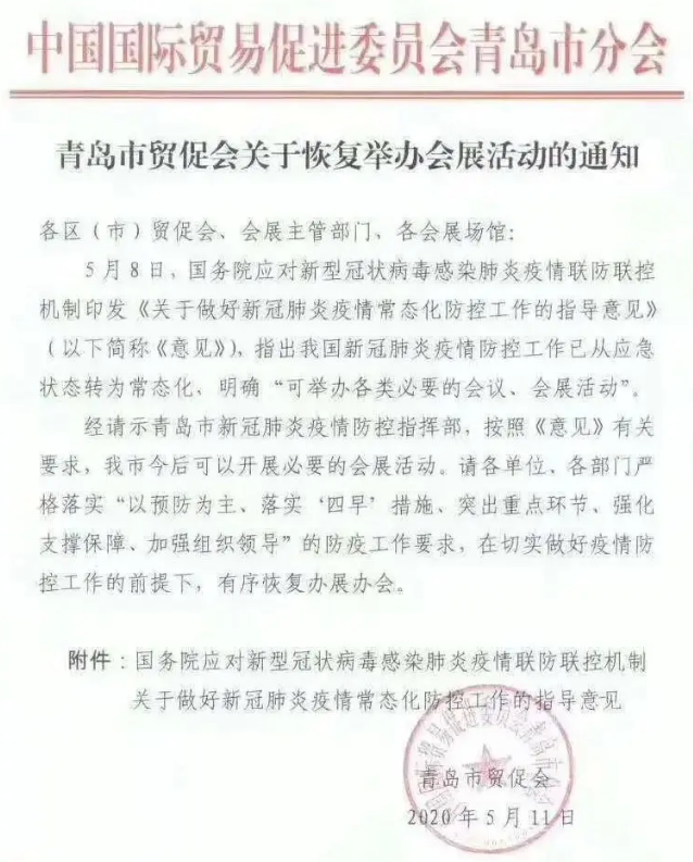 伴隨兩會落幕,國家大力支持企業復工復產,并積極出臺多項扶持政策,加強提升產業鏈現代化水平,全面落實“六穩”“六保”要求,積極推動會展、基建等產業快速發展,穩步恢復民生經濟。 如期開展 政府發聲 隨著全國各會展城市紛紛按下重啟鍵,CIPI2020青島國際包裝工業展覽會進入最后的沖刺階段。作為下半年環渤海灣地區包裝行業首展,本次展會對于提振市場信心、拉動市場消費有著“牽一發動全身”的影響力,將為市場起到標志性、示范性效應,會展業復蘇意味著市場的真正復蘇。