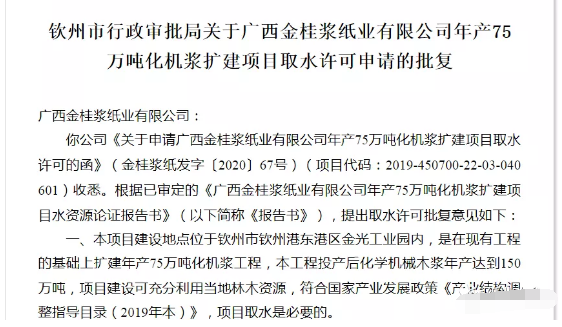 6月22日,欽州市行政審批局發(fā)布了關(guān)于廣西金桂漿紙業(yè)有限公司年產(chǎn)75萬噸化機漿擴建項目取水許可申請的批復,項目用水和排水問題都得到解決。