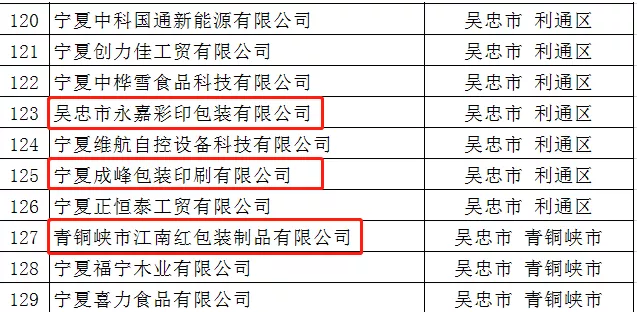 【上圖:2020年自治區“專精特新”擬培育入庫企業名單】 寧夏成峰包裝印刷有限公司經營范圍包括包裝裝潢印刷品印刷;紙制品、包裝品的加工、銷售;印刷材料的銷售。據悉,寧夏成峰包裝印刷有限公司年產9000萬只高檔包裝紙箱改造擴建項目,經吳忠市工業和信息化局審定,2019年獲得補助資金100萬。 青銅峽市江南紅包裝制品有限公司成立于2015年04月27日,注冊地位于寧夏青銅峽工業園區。經營范圍包括包裝紙板加工及銷售;原紙銷售。該公司于2015年7月投產,主要生產2層、3層至7層瓦楞紙板。 吳忠市永嘉彩印包裝有限公司成立于2012年05月14日,注冊地位于吳忠市利通區巴浪湖農場。經營范圍包括其他印刷品印制;包裝裝潢印刷品印刷;塑料制品、紙制品、包裝紙材料、裝飾材料的銷售。