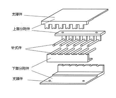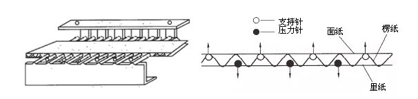 3、粘合強度的測試方法 按照國家標準GB/T 6544-2008中附錄B“瓦楞紙板粘合強度的測定”要求進行試驗。試樣的采取按GB/T 450進行,試樣的處理及測試和環境條件應按GB/T 10739要求進行,嚴格確定溫濕度。試樣的制備應從樣品中切取10個單瓦楞紙板、或20個雙瓦楞紙板或30個三瓦楞紙板(25±0.5)mm×(100±1)mm的試樣,瓦楞方向應與短邊方向一致。 試驗時,先將被測試樣裝入附件,將帶有兩排金屬棒的針形附件插入試樣的面紙與芯紙之間,并對好支撐柱,注意不要破壞試樣,如下圖所示。然后將其放在壓縮儀下壓板的中心位置。開動壓縮儀,以(12.5±2.5)mm/min的速度對裝有試樣的附件施壓,直到楞峰和面紙(或里/中紙)分離為止。記錄顯示的最大力,精確至1N。在下圖中的右圖所示的分離是楞紙與里紙的分離,共插入了7根針,有效分離了6根楞。 對于單瓦楞紙板,應分別測試面紙與楞紙、楞紙與里紙的分離力各5次,共測10次;雙瓦楞紙板則應分別測試面紙與楞紙1、楞紙1與中紙、中紙與楞紙2、楞紙2與里紙的分離力各5次,共測20次;三瓦楞紙板則需共測30次。