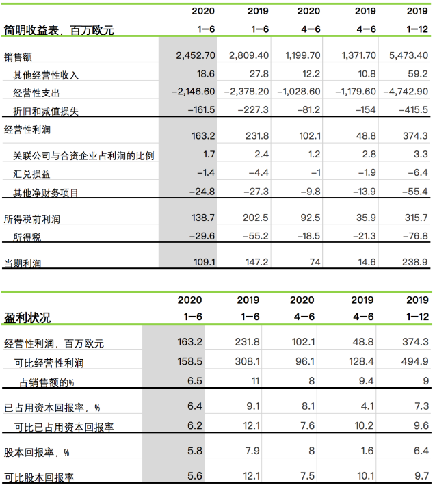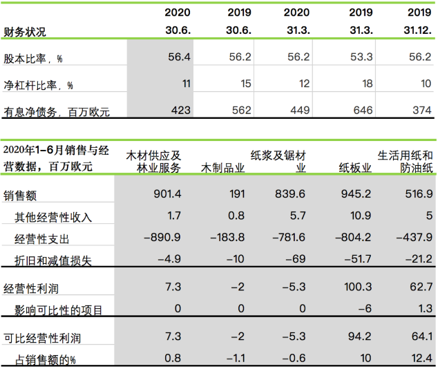 芬林集團財務報告 2020年1-6月 2020年1-6月 (與2019年1-6月相比) 銷售額為24.53億歐元(去年同期:28.09億歐元)。 經營性利潤為1.63億歐元(去年同期:2.32億歐元)。可比經營性利潤為1.58億歐元(去年同期:3.08億歐元)。 稅前利潤為1.39億歐元(去年同期:2.02億歐元)。可比稅前利潤為1.34億歐元(去年同期:2.79億歐元)。 可比已占用資本回報率為6.2%(去年同期:12.1%)。 經營現金流為2.4億歐元(去年同期:1.83億歐元)。 2020年4-6月 (與2019年4-6月相比) 銷售額為12億歐元(去年同期:13.72億歐元)。 經營性利潤為1.02億歐元(去年同期:4900萬歐元)。可比經營性利潤為9600萬歐元(去年同期:1.28億歐元)。 稅前利潤為9300萬歐元(去年同期:3600萬歐元)。可比稅前利潤為8600萬歐元(去年同期:1.15億歐元)。 可比已占用資本回報率為7.6%(去年同期:10.2%)。 經營現金流為1.9億歐元(去年同期:1.42億歐元)。 2020年第二季度主要事件 與上一季度相比,長纖漿的平均美元市場價格略有上升,短纖漿的平均美元市場價格保持穩定。不過,兩種漿的價格均明顯低于去年同期。 紙板的交付量高于去年同期,價格保持相對穩定。 芬蘭凱米(Kemi)生物制品廠的前期工程項目仍在按計劃進行。環境許可申請的補充資料已于4月提交給監管當局。工廠主要設備、自動化系統、電氣系統、項目管理、實施計劃和施工已簽署初步協議。 芬蘭勞馬(Rauma)鋸木廠的土方工程已經開始。在第二季度,公司還簽署了有關主要設備、土方工程和建筑工程的協議。 由于新冠肺炎疫情大流行,工廠的年度維修停機被推遲到下半年。 新冠肺炎疫情大流行 在阻止新冠疫情大流行方面,芬林集團在運營中重點關注三個方面:所有人員的健康與安全、履行社會責任全力參與抗擊疫情、確保業務連續性。芬林集團遵循并遵守政府機構發布的新冠疫情指南。避免身體近距離接觸是最重要的預防措施。 在新冠疫情大流行期間,芬林集團的資源狀況保持正常。通過嚴格的安全措施可以防止感染鏈。除了英國的子公司、俄羅斯的Svir鋸木廠和俄羅斯的木材供應以外,其他地區的生產和交貨均保持正常。 2020年7-9月績效預測 2020年第三季度,芬林集團的可比經營性利潤預計將比2020年第二季度有所下降。