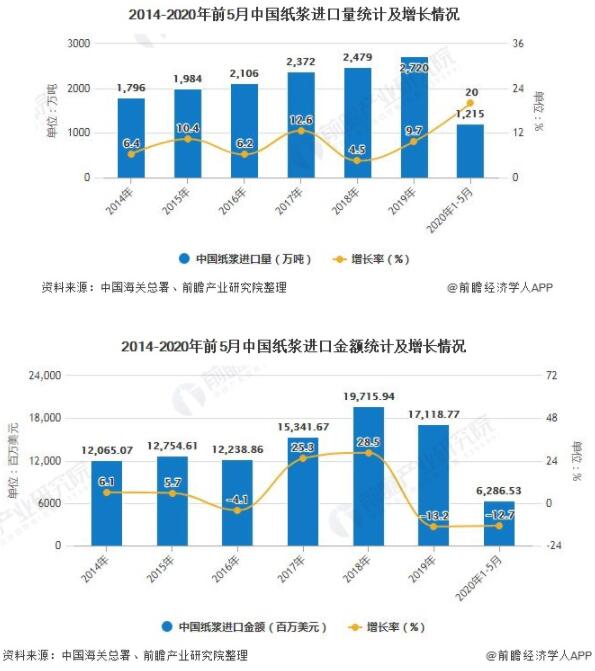 2020年1-5月中國(guó)紙漿進(jìn)口量突破千萬(wàn)噸 據(jù)中國(guó)海關(guān)總署統(tǒng)計(jì)數(shù)據(jù)顯示,2019年去年中國(guó)紙漿進(jìn)口量達(dá)到了2720萬(wàn)噸,累計(jì)增長(zhǎng)9.7%。截止至2020年5月中國(guó)紙漿進(jìn)口量為228萬(wàn)噸,同比下降7%。累計(jì)方面,2020年1-5月中國(guó)紙漿進(jìn)口量達(dá)到1215萬(wàn)噸,相比上年同期增長(zhǎng)了202萬(wàn)噸,累計(jì)增長(zhǎng)20%。 在進(jìn)口金額方面,2019年去年中國(guó)紙漿進(jìn)口金額達(dá)到了17118772千美元(17118.77百萬(wàn)美元),累計(jì)下降13.2%。截止至2020年5月中國(guó)紙漿進(jìn)口金額為1194278千美元(1194.28百萬(wàn)美元),同比下降27.9%。 累計(jì)方面,2020年1-5月中國(guó)紙漿進(jìn)口進(jìn)口金額達(dá)到6286528千美元(6286.53百萬(wàn)美元),相比上年同期減少了911879千美元,累計(jì)下降12.7%;2020年1-5月中國(guó)紙漿進(jìn)口均價(jià)為5174.10千美元/萬(wàn)噸。