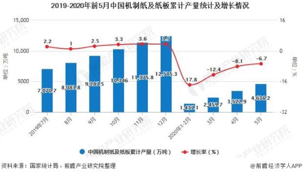 2020年1-5月中國(guó)機(jī)制紙及紙板累計(jì)產(chǎn)量超4600萬(wàn)噸 據(jù)國(guó)家統(tǒng)計(jì)局?jǐn)?shù)據(jù)顯示,2019年全年中國(guó)機(jī)制紙及紙板(外購(gòu)原紙加工除外)產(chǎn)量達(dá)到12515.3萬(wàn)噸,累計(jì)增長(zhǎng)3.5%。截止至2020年5月中國(guó)機(jī)制紙及紙板(外購(gòu)原紙加工除外)產(chǎn)量為1076.7萬(wàn)噸,同比下降0.5%。累計(jì)方面,2020年1-5月中國(guó)機(jī)制紙及紙板(外購(gòu)原紙加工除外)累計(jì)產(chǎn)量達(dá)到4636.2萬(wàn)噸,累計(jì)下降6.7%。