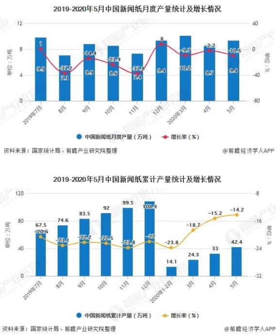 2020年1-5月中國(guó)新聞紙累計(jì)產(chǎn)量突破40萬(wàn)噸 據(jù)國(guó)家統(tǒng)計(jì)局?jǐn)?shù)據(jù)顯示,2019年全年中國(guó)新聞紙產(chǎn)量達(dá)到了108.85萬(wàn)噸,累計(jì)下降22%。截止至2020年5月中國(guó)新聞紙產(chǎn)量為9.4萬(wàn)噸,同比下降10.5%。累計(jì)方面,2020年1-5月中國(guó)新聞紙累計(jì)產(chǎn)量達(dá)到42.4萬(wàn)噸,累計(jì)下降14.2%。