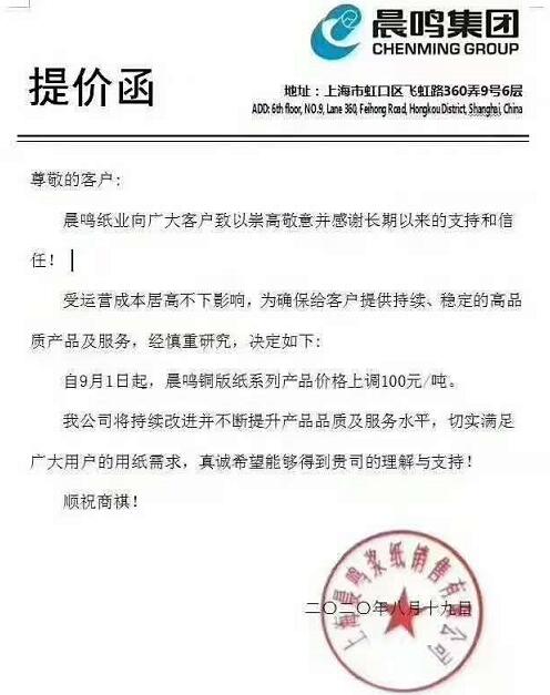 上海晨鳴漿紙銷售公司:受運營成本居高不下影響,為確保給客戶提供持續、穩定的高品質產品及服務,經慎重研究,決定如下:自9月1日起,晨鳴銅版紙系列產品價格上調100元/噸。