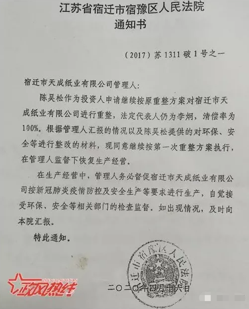 后來,宿遷市宿豫區人民法院從保護債權人權益,維護社會穩定角度出發,裁定引入新的投資方對企業進行重組。 2019年11月27日,宿豫區人民法院通知宿遷天成紙業有限公司投資人可以進場開展檢修,準備開工生產。隨后該企業進行節能改造、設備調試生產等工作,同時按照當地環保部門要求,對相關廢棄放射源進行了處理。 但是啊但是,重組之路波折重重,不是想象當中的那么順利。比如,在生產安全、環保等方面,任何一個關節有阻礙,重組便會導致夭折。